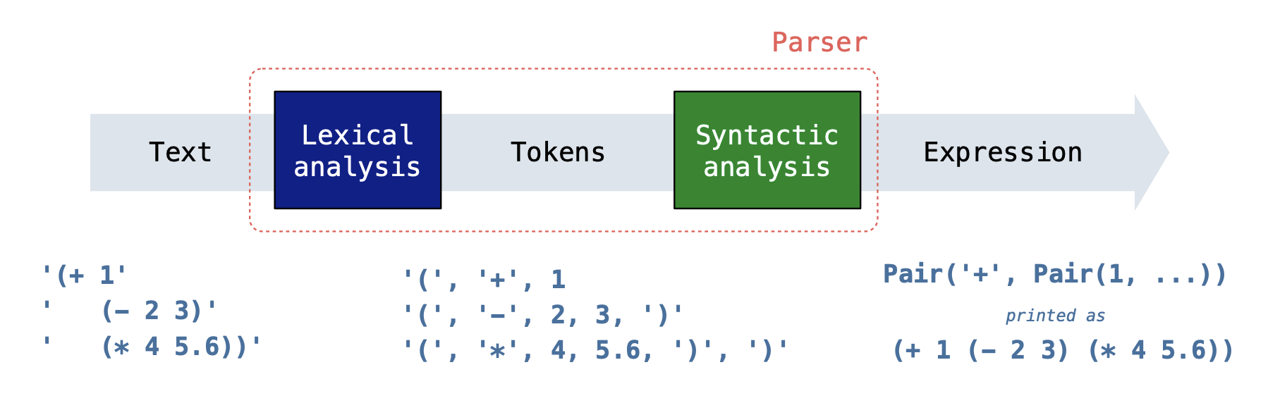 The syntactic analysis step takes the tokens from the previous step and organizes them into a data structure that the underlying language can understand. For our Scheme interpreter, we assemble the tokens into a