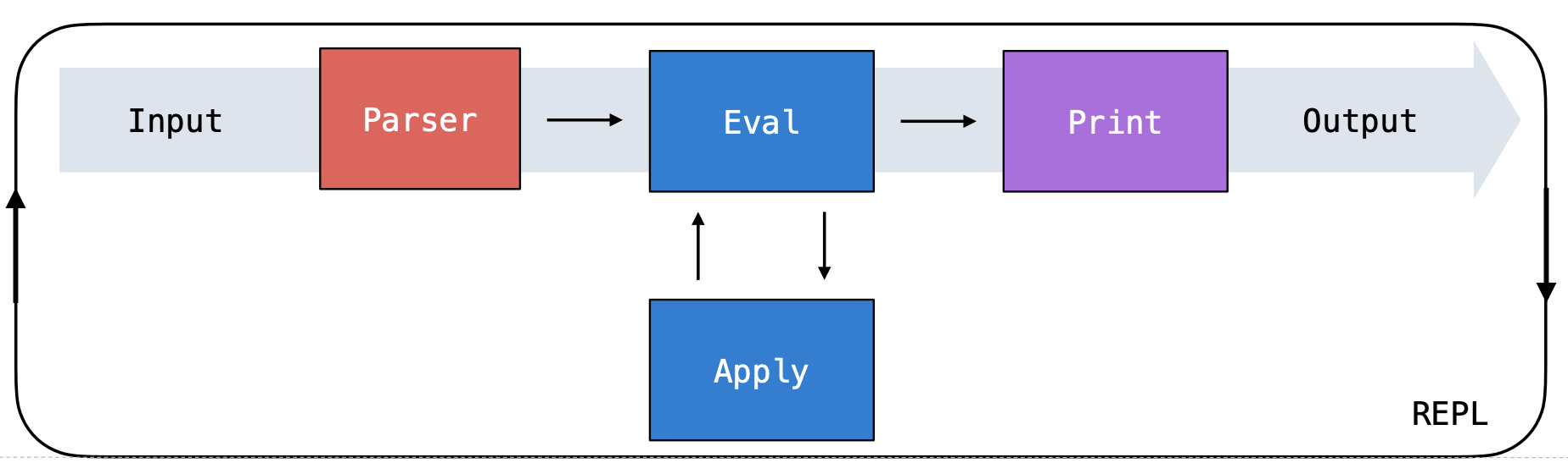 A common feature of interpreters is the Read-Eval-Print Loop (REPL), which processes user inputs in a cyclic fashion through three stages: